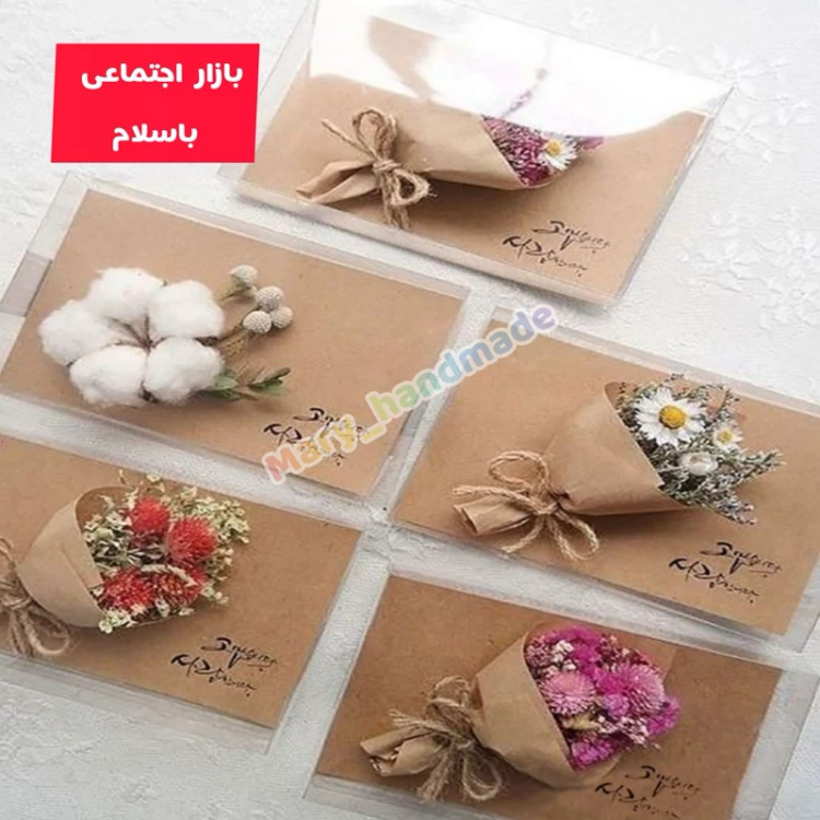 کارت تبریک با مقوای فابریانو کاهی تزئین شده با دسته گلهای خشک شده طبیعی